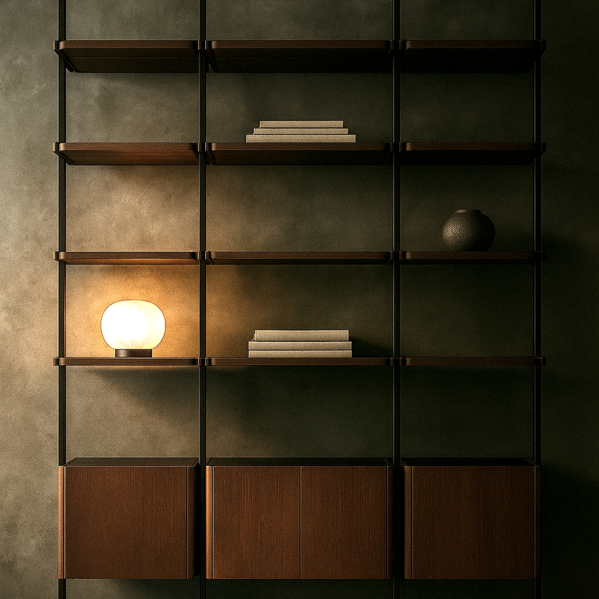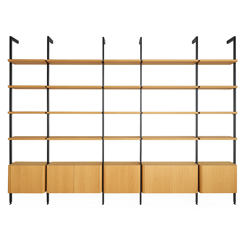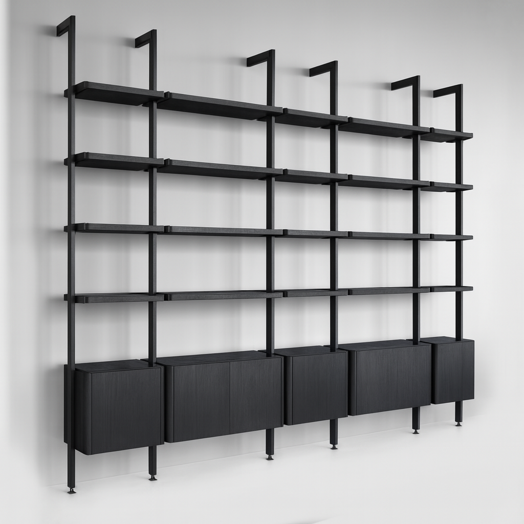 Discover a refined, architectural shelving system designed to adapt effortlessly to modern living and working spaces. Crafted with premium oak or walnut veneer shelves, Dash highlights natural wood texture while maintaining a clean, contemporary aesthetic. The structure is built on a robust metal frame, available in a variety of powder-coated finishes, allowing you to personalise the look to suit any interior style. For added functionality, the system can be configured with or without integrated cabinets.